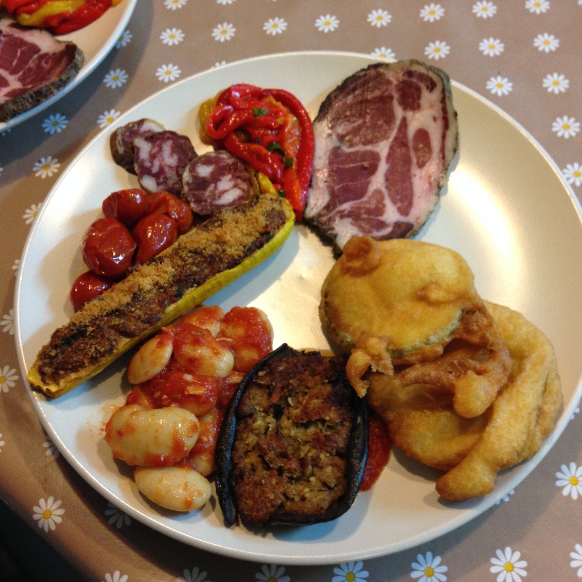 Suit une assiette d'antipasti , soit "di mare" diverses préparations à base de produits de la mer et de légumes, selon la pêche. Soit "di terra" avec charcuterie corse (la vraie), caponata sicilienne, aubergines à la bonifacienne, beignets de courgettes ... Selon le jardin et le marché, j'assemble le meilleur de la cuisine méditerranéenne et des produits frais du jour. Parfois le plat principal sera in beau poisson, ou bien une assiette de pâtes "alla scogliera"