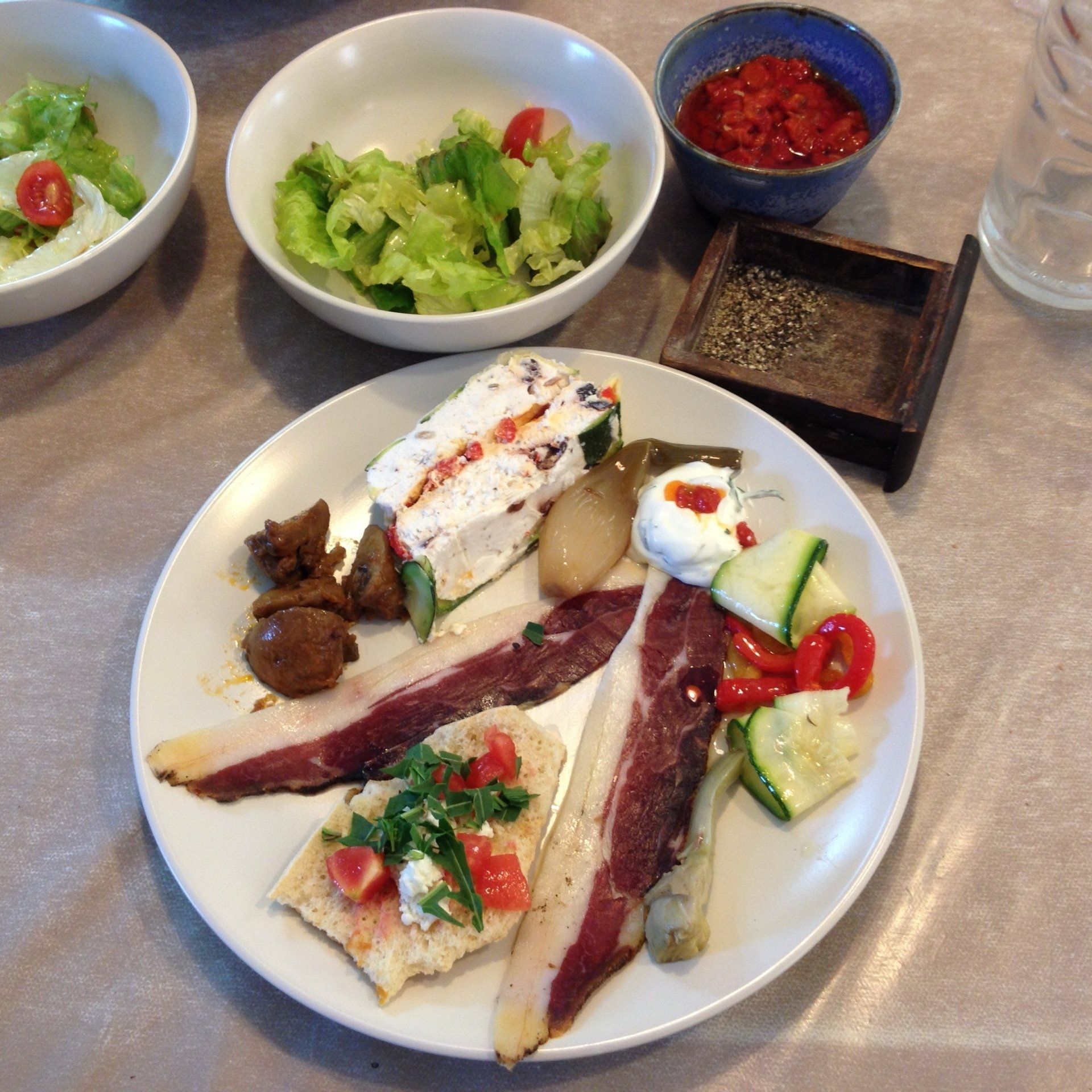 Nous ne servons pas de charcuterie le matin, tout simplement parce que ce n'est pas la tradition en Corse : la vraie charcuterie corse, le vrai fromage ont un goût très puissant qui ne s'accorde pas avec un petit déjeuner. Et nous refusons de servir des produits semi industriels. Si vous voulez goûter une bonne assiette de charcuterie (avec la bonne salade de tomates du jardin), il faudra dîner chez nous un soir. Et vous allez vous régaler !