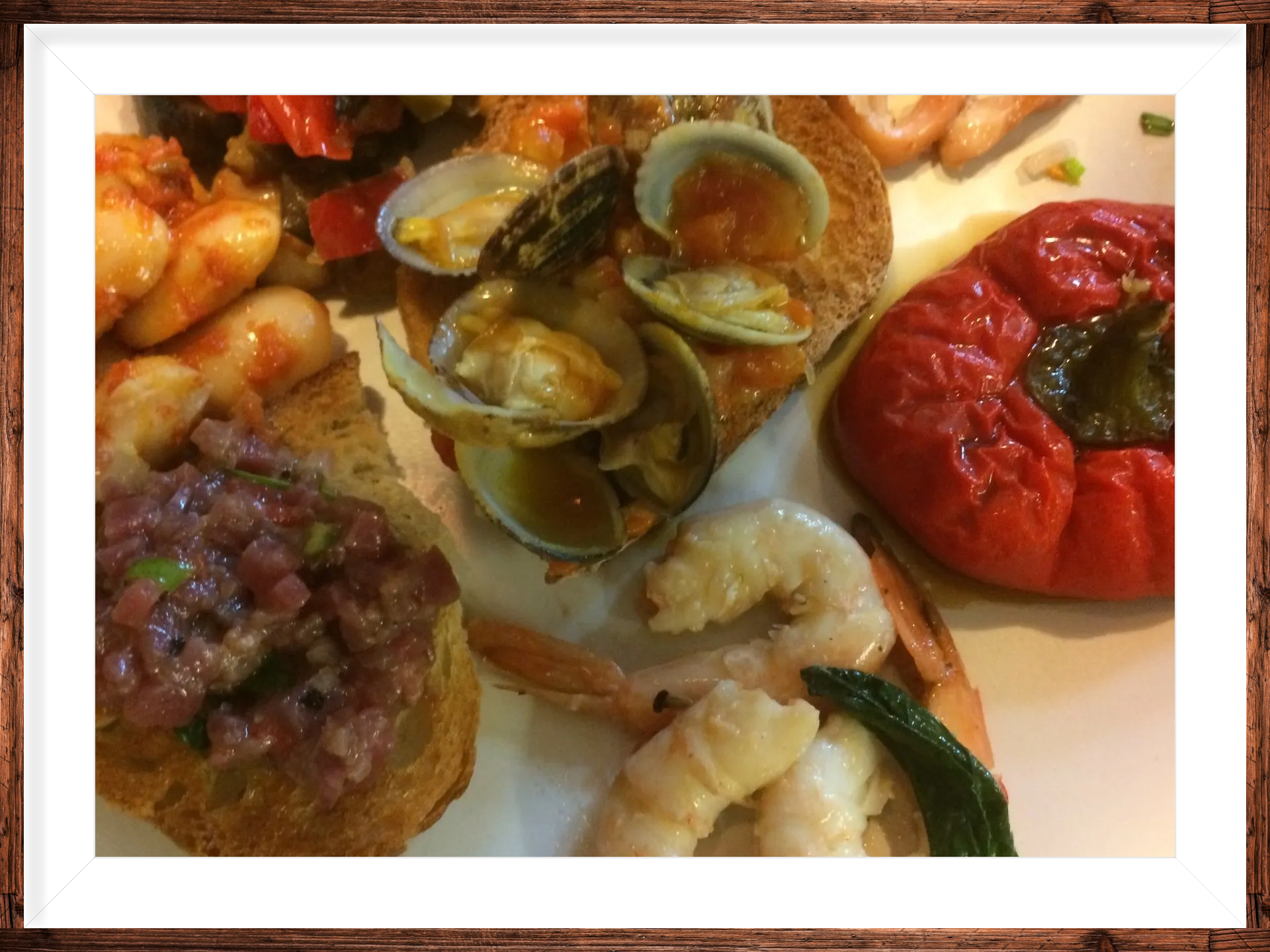 Suit une assiette d'antipasti , soit "di mare" diverses préparations à base de produits de la mer et de légumes, selon la pêche. Soit "di terra" avec charcuterie corse (la vraie), caponata sicilienne, aubergines à la bonifacienne, beignets de courgettes ... Selon le jardin et le marché, j'assemble le meilleur de la cuisine méditerranéenne et des produits frais du jour. Parfois le plat principal sera in beau poisson, ou bien une assiette de pâtes "alla scogliera"